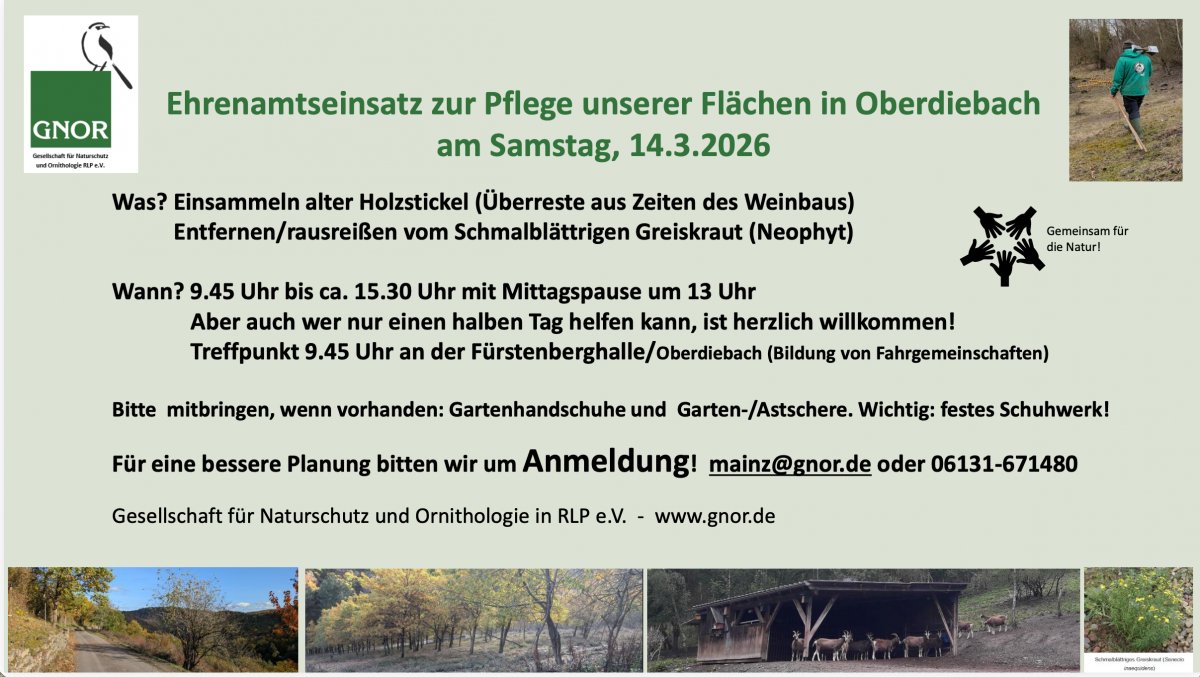 Ehrenamtseinsatz zur Pflege von Beweidungsflächen der GNOR am Samstag, den 14.März 2026 um 9:45 Uhr Trefffpunkt Fürstenberghalle ----- Nächste Gemeinderatssitzung am Donnerstag, den 19. März 2026 um 19:30 Uhr in der Alten Schule ----- Landtagswahl am Sonntag, den 22. März von 8 bis 18 Uhr: Wahllokal für Oberdiebach, Winzberg und (neu) Rheindiebach ist die Fürstenberghalle in Oberdiebach! ----- Workshop Dorfmoderation "Das Miteinander gestalten" am Donnerstag, den 26. März um 19 Uhr in der Fürstenberghalle -----