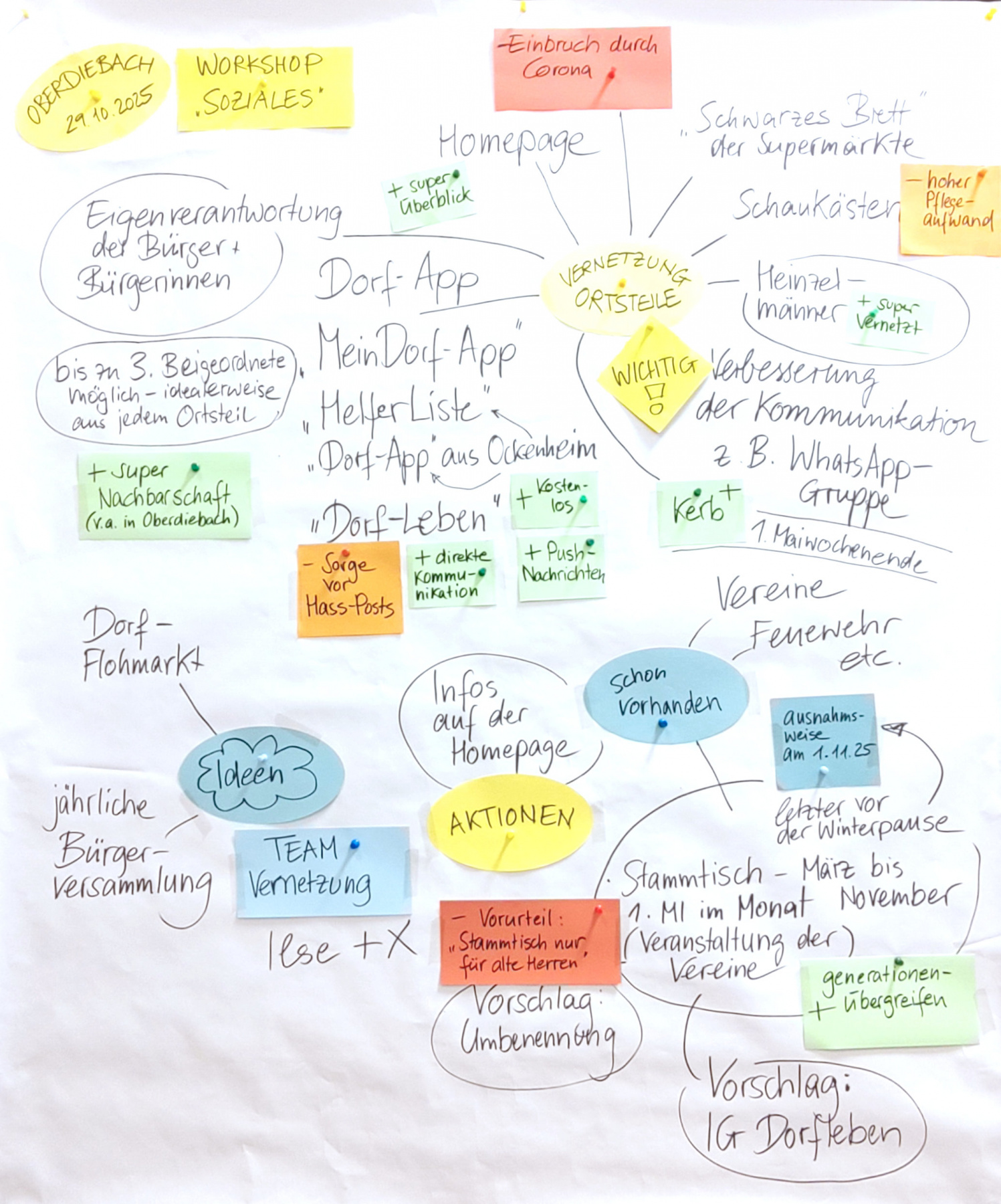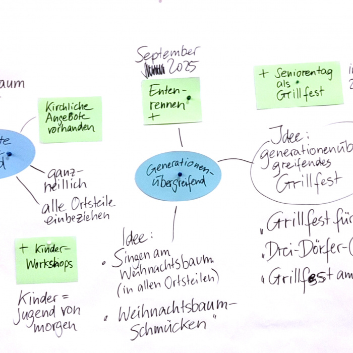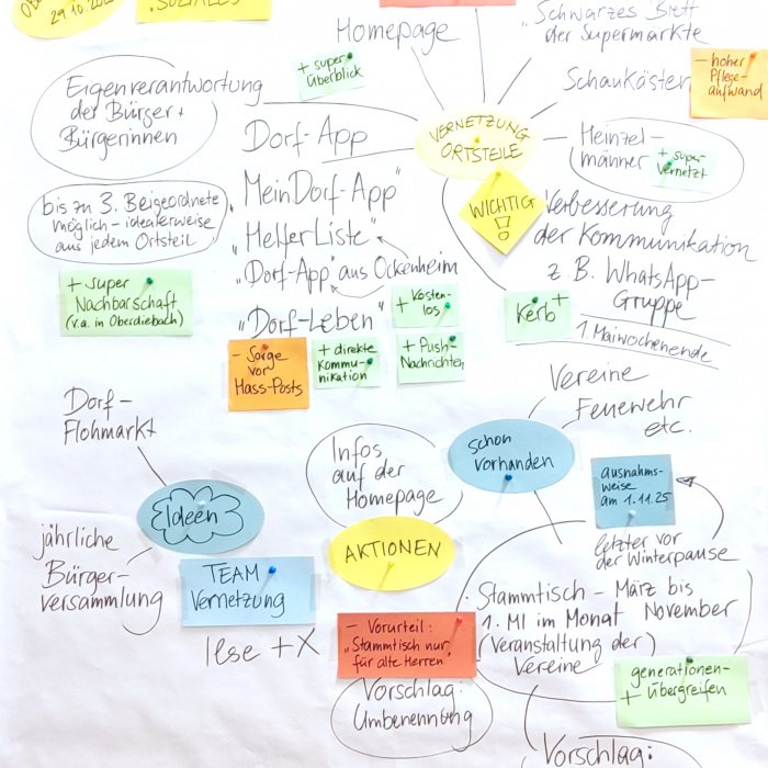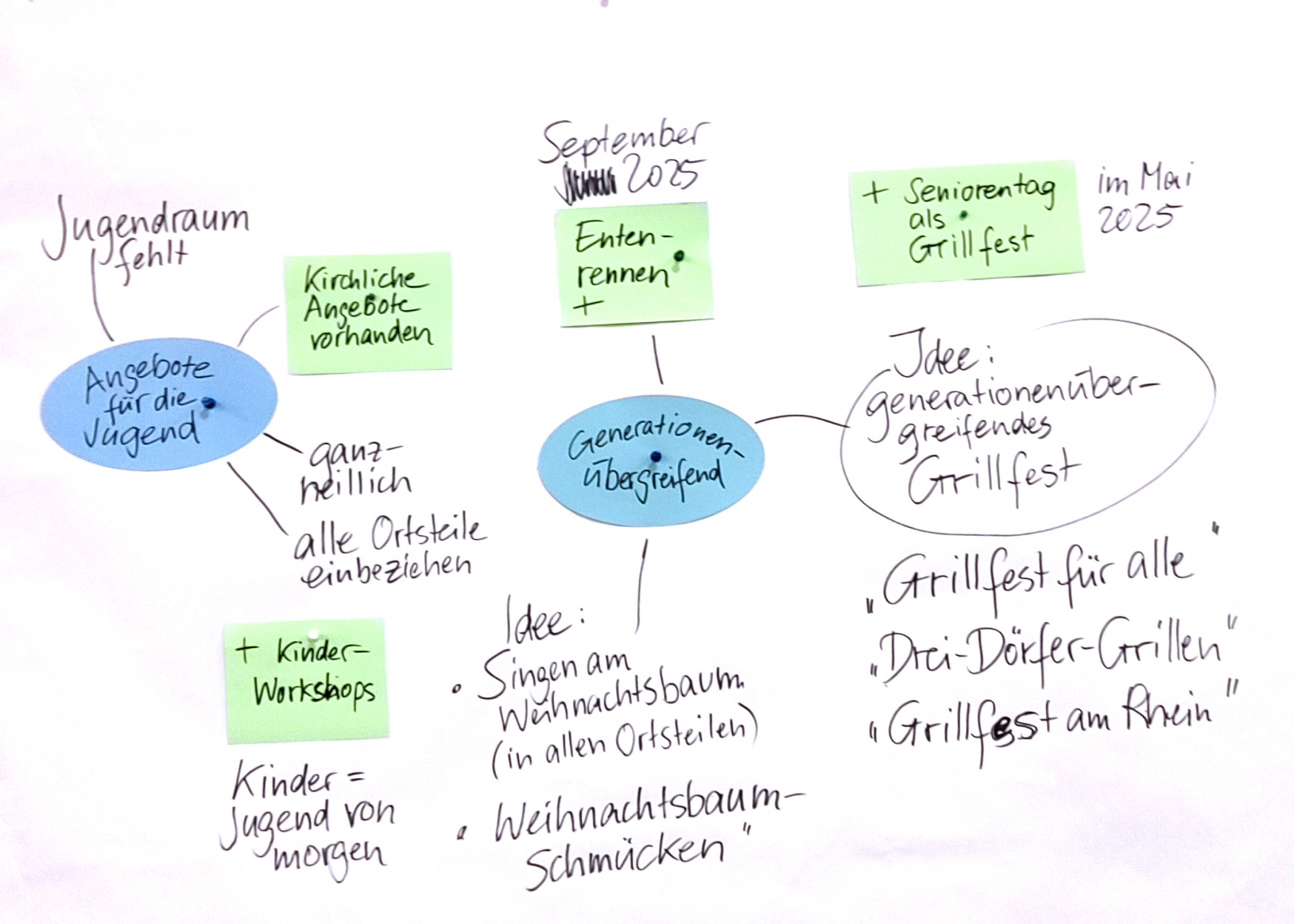 Am Mittwoch, den 26. Februar trafen sich rund 50 interessierte Einwohnerinnen und Einwohner zur Auftaktveranstaltung für das Dorferneuerungskonzept. Und am 22. März wurden weitere Ideen beim Dorfrundgang gesammelt. Die Wünsche der Kinder wurden in einem besonderen Workshop am 24. Juni aufgenommen. Auch beim Workshop "Gastronomie und Versorgung" am 27. August wurden zahlreiche kreative Ideen geäußert. Bei leider geringer Beteiligung fand am 29.10.2025 der Workshop "Soziales" statt.