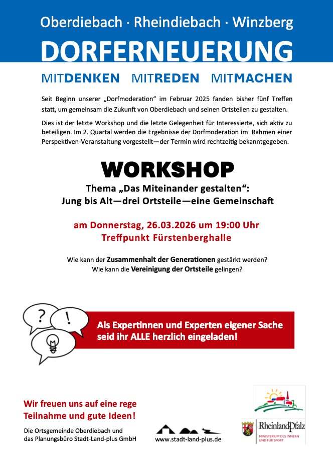 Nächster Arbeitseinsatz der Heinzelmänner am Mittwoch, den 4. März 2026 um 8:30 Uhr an der Alten Schule ----- Nächster Stammtisch am Mittwoch, den 04. März 2026 um 18 Uhr an der Fürstenberghalle ----- Nächste Gemeinderatssitzung am Donnerstag, den 19. März 2026 um 19:30 Uhr in der Alten Schule ----- Landtagswahl am Sonntag, den 22. März von 8 bis 18 Uhr: Wahllokal für Oberdiebach, Winzberg und (neu) Rheindiebach ist die Fürstenberghalle in Oberdiebach! ----- Workshop Dorfmoderation "Das Miteinander gestalten" am Donnerstag, den 26. März um 19 Uhr in der Fürstenberghalle -----
