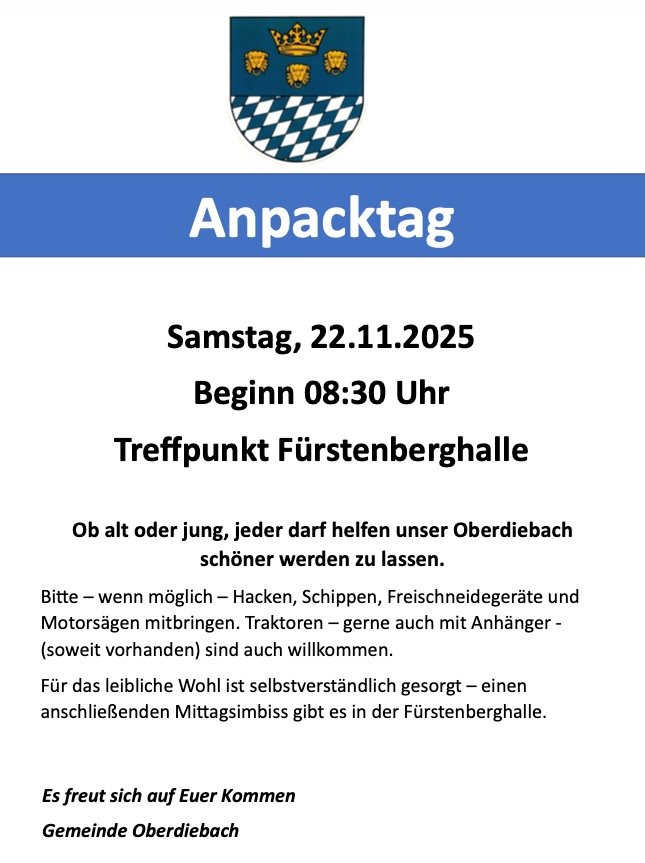 ----- Dorfmoderation Workshop "Soziales" am Mittwoch, 29. Oktober um 19 Uhr in der Fürstenberghalle ----- Mitgliederversammlung Wasserleitungsgenossenschaft am Mittwoch, 5. November um 19 Uhr in der Fürstenberghalle ----- Nächste Gemeinderatssitzung am Donnerstag, 20. November um 19:30 Uhr in der Alten Schule ----- Anpacktag mit vielen fleißigen Helfern am Samstag, 22. November um 8:30 Uhr an der Füstenberghalle -----